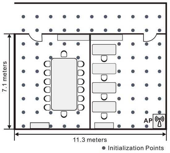 Layout and database points of the empty room. The access point (AP) is placed at the lower-right corner.