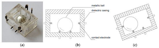 As an example, a commercial single-axis tilt switch (by an unknown manufacturer), having the free member in the form of ball with diameter of 9 mm and contact wires with diameter of 0.7 mm, is presented in Figure 2a. The switch generates three possible signals, corresponding to inclination to the left (see Figure 2c), the horizontal position (see Figure 2a,b), or inclination to the right. Both the ball and the contact wires are coated with iridium in order to provide low transition resistance between these elements.