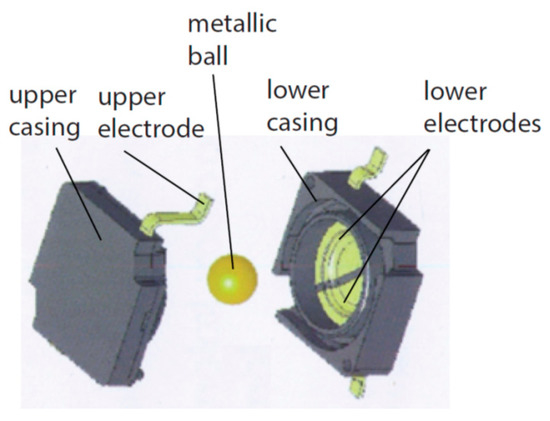 Whereas commercially available tilt switches are usually very simple, there are some interesting patented solutions, e.g., [44,45]. Two examples are presented in Figure 5 and Figure 6.