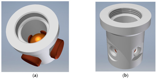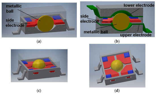 Two designs described in patents [42,43] feature a structure similar to the dual-axis switch presented in Figure 3. The switch illustrated in Figure 4a also has four electrodes, yet there is created a cavity in the center of the bottom and the top of its casing. If the switch is oriented approximately horizontally (either low-side down or up-side down), the metallic ball remains in the cavity and is not in contact with any of the side electrodes, so no signal is generated. Only while tilted, the ball short-circuits two adjacent respective side electrodes. Thus, the switch generates four possible signals, not distinguishing between low-side down or up-side down orientation, similarly to the dual-axis switch presented in Figure 3. In other words, its detection range covers only half of the full solid angle.