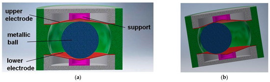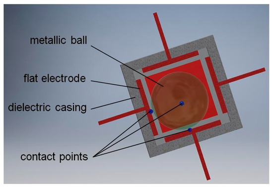 An original dual-axis tilt switch is presented in Figure 6. The novel feature of the switch is application of electrodes, which from the mechanical point of view operate as flat springs or a membrane. The electrodes have additionally special cuts (not visible in Figure 6) that make them even more flexible [45].
