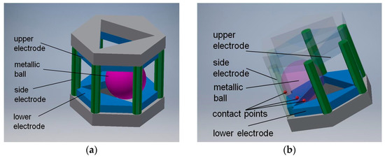 The general principle adopted in original patented designs [46,47] is presented in Figure 8. The full solid angle is divided into six detection sub-ranges: three sub-ranges when the metallic ball is contained within the triangular opening of the lower electrode, and another three sub-ranges when the ball is within the triangular opening of the upper electrode. The triangular openings are rotated by 60° with respect to one another, in order to arrange in a symmetric way (hexagonal configuration) the side electrodes, having a form of six posts electrically insulated from the other members. The aforementioned three points of support are in this case two contact points between the ball and two internal edges of the triangular opening, and the contact point between the ball and one of the side electrodes (see Figure 8b).