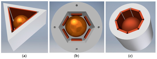 Tilt sensors with prismatic shape and spherical free element (view without the upper electrode): (a) triangular prism; (b) hexagonal prism; (c) octagonal prism.
