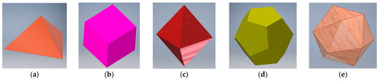 In order to divide the steregon into uniform sub-ranges, it is advantageous to incorporate for this purpose Platonic solids, whose vertices create contact points with the circumscribed sphere; the points are centers of the detection sub-ranges [49]. However, there exist only five solids of this type: tetrahedron, cube, octahedron, dodecahedron, icosahedron—all presented in Figure 11.