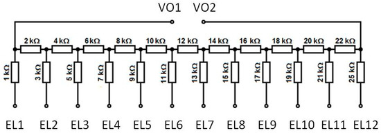 Resistance circuit created for the dodecahedron sensor illustrated in Figure 12b: EL1–EL12, electrodes of the sensor; VO1–VO2, analog voltage outputs.