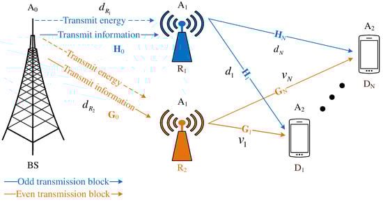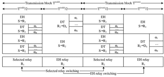 From the model depicted in Figure 1, we designed a new propagation diagram, as shown in Figure 2. The coupled relays feed back data to the BS about their energy capacities. The BS decides which relay has more energy to forward the superimposed signal, while the remaining relay has less energy to maintain EH. Two main phases take place: EH and data transmission (DT). To illustrate, Figure 2 depicts two transmission blocks: an odd transmission block and an even transmission block . Each transmission block for is separated into two equal time slots. The first time slot in odd transmission block is used by the BS to transmit wireless energy and superimposed information to coupled relays . In terms of the SWIPT technique with a PS protocol, during the first time slot , a fraction of the power domain is used for EH while the remaining fraction () of the power domain is used to superimpose data from the BS. The second time slot in odd transmission block is used by the best powered relay to forward the superimposed signal to devices, while the worse powered relay applies EH from the BS, where the PS factor . The present study assumes that relay is selected in the odd transmission block because relay has more energy than relay . Therefore, relay maintains EH from the BS. Similarly, the even transmission block is also separated into two equal time slots. The first time slot in even transmission block is also used by the BS to simultaneously transmit wireless energy and the superimposed signal to the coupled relay . However, in the second time slot in even transmission block , the relay is selected to forward the superimposed signal to devices instead of relay because relay harvested energy from the BS, where during , and then relay contains more energy than relay . As a result, relay maintains EH from the BS with PS factor during . Although the network model shown in Figure 1 is complex, it requires two time slots for signals to propagate through the network as in studies [,,]. Specifically, the present study examines how multiple devices are served simultaneously. We therefore adopt the emerging NOMA technique. The BS also superimposes all the information of devices in the same signal by sharing the spectrum. The devices may be thus served simultaneously. As a result, the massive MIMO-NOMA network in the present study are low latency.