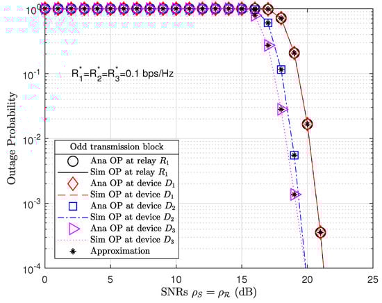 Figure 3 plots the OP performance at relay and devices in odd transmission blocks. Note the various markers and line plot analysis (Ana) and simulation (Sim) results. The analysis results of OP performance at relay are given by (30) or (34) and for devices by (36) or (38). The analysis results were verified with Monte Carlo simulations for relay given by (31) or (35) and for devices by (37) or (39), where and . Figure 3 illustrates that device achieved the best OP results, even though device was the farthest device and therefore allocated the biggest PA factor . When SRN , the OP results of relay and devices tend toward zero.
