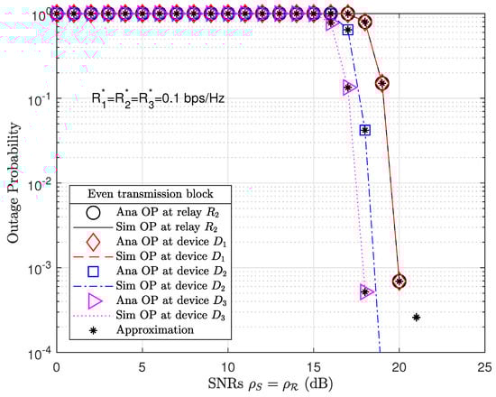 Figure 4 plots the OP performance at relay and devices in even transmission blocks. To improve the networking capacity and energy, we equipped a large number of antennas at relay and increased the PS factor . By increasing the PS factor, relay was able to harvest more energy but relay could receive weak signals. However, we may observe that the OP performance at relay and devices in even transmission blocks (Figure 4) achieved better results than OP performance at relay and devices in odd transmission blocks (Figure 3). The analysis results of OP performance for relay are given by (30) or (34) and for devices by (36) or (38), where and . The analysis results were verified with Monte Carlo simulations for relay given by (31) or (35) and for devices by (37) or (39), where and .