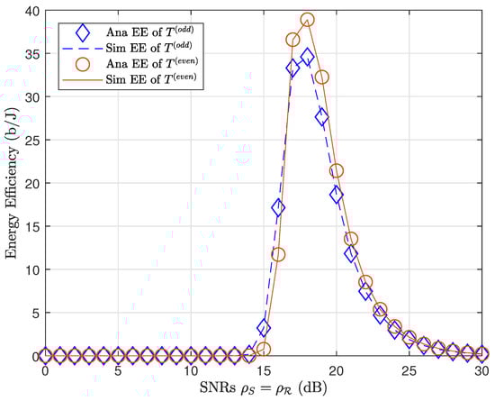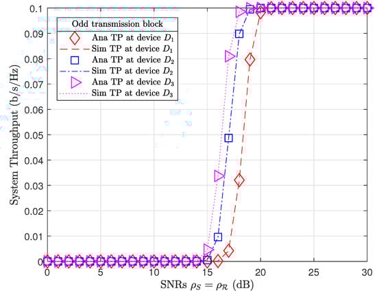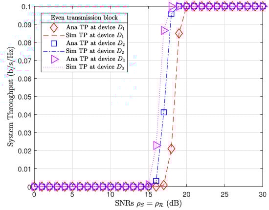To illustrate, we extract the investigated results from Matlab software. At a SNR range , device throughput in odd and even transmission blocks achieved and , respectively. We may observe that device throughput in odd transmission blocks outperformed device throughput in even transmission blocks at low SNRs, i.e., . However, device throughput in even transmission blocks improved and outperformed device throughput in odd transmission blocks at high SNRs, i.e., dB. Device throughput also tended toward their data rate thresholds, i.e., when the SNRs . As a result, system throughput in both odd and even transmission blocks at high SNRs dB. It is important to note that the PS factor in even transmission blocks () was greater than the PS factor in odd transmission blocks (). Therefore, the relay in even transmission blocks harvested more energy than relay in odd transmission blocks. Certainly, even transmission blocks achieved better EE performance than odd transmission blocks.