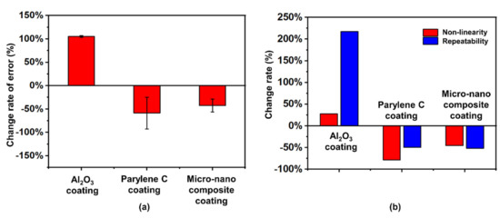 According to the error theory, we selected several key indicators as examples for analysis. For example, the non-linearity and repeatability of the device after the atomic layer deposition of Al2O3 dropped substantially: the change rate of repeatability was more than 200%, but the two indicators were improved for the devices over Parylene C encapsulation. Similarly, the device with double-layer micro-nano composite structure encapsulation improved the adverse effects of Al2O3 encapsulation on devices in nonlinearity and repeatability. The performance change of the device is shown in Figure 4b. The experimental results showed that the double-layer micro-nano composite structure encapsulation highlighted the influence of Parylene C encapsulation on the deformation of sensitive components in the sensor, which can be buffered by the dense, large elastic modulus of Al2O3. The superiority of this encapsulation method in device encapsulation and the defect filling method of micro-nano composite structure can achieve a better waterproof effect.