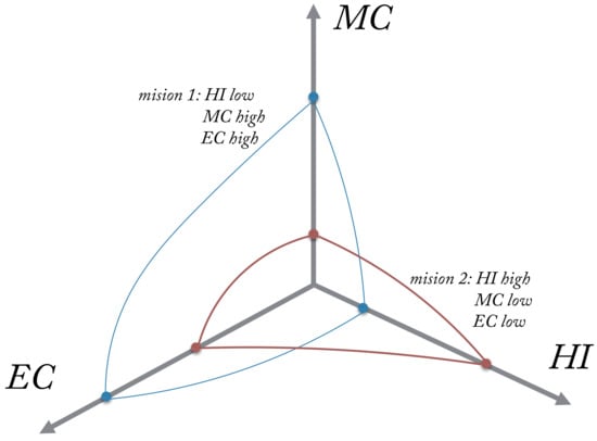Autonomy model in the ALFUS framework. Two hypothetical missions are shown to exemplify the relationship between mission complexity (MC), environmental complexity (EC) and human independence (HI).