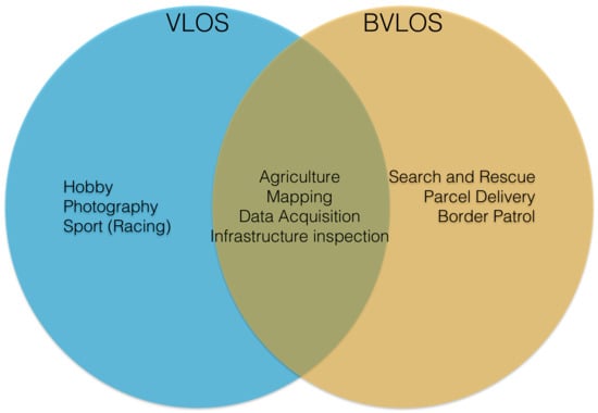 Visual line-of-sight (VLOS) and beyond VLOS (BLOS) categorisation for several common Unmanned Aircraft System (UAS) applications. Some of these application can be considered in the intersection of the two categories, i.e., can be performed by either VLOS or BVLOS.