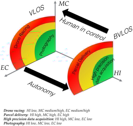 Example applications referenced above can be mapped into the ALFUS model based on their requirements for EC, MC and HI. In Figure 3, we introduce four applications with their respective requirements in terms of EC, MC and HI. Qualitatively, it can be seen that Drone Racing and Photography can comfortably be placed in the MC, EC plane (e.g., VLOS) meaning they are currently performed by highly trained pilots (very low HI), whereas Data Acquisition and Parcel Delivery require moderately high levels of HI.