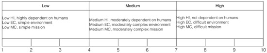 Human independence (HI), environment (EC) and mission (MC) complexities, mapped to a scale 1–10. Autonomy increases with scale.