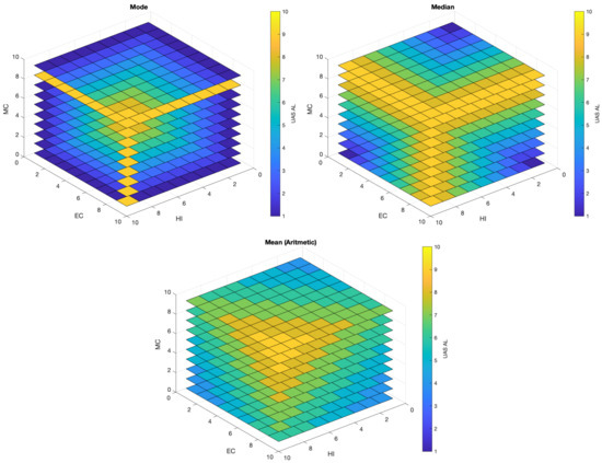 Based on the description provided for each application. We assign an integer value in the range [1,10] to each of the three aspects of the ALFUS model, HI, MC and EC, for each application (see Figure 4 and Table 2). Based on experience [26,34,76], we propose a number of tasks required to ensure feasibility of each application. We then provide three ways to estimate the UAS AL metric, mode, median and mean (arithmetic) of the three values for HI, MC and EC. Since there are multiple ways to find the central tendency for these values, we find the arithmetic mean (rounded to the nearest integer) provides the best balance between under/over estimation of UAS AL. In Figure 5, we show the estimation of these values using a scale 1 to 10. We can observe how the arithmetic mean can provide smoother transitions between levels and it is less biased towards HI. The UAS AL allows us to relate an application with a required autonomy level and the number of tasks to achieve it. We have observed a level of proportionality between the UAS AL and the number of tasks (or functions) a UAS should implement. The UAS AL is not a prescribed metric but rather a suggestion on how to map every aspect of the ALFUS model to a numerical scale that can be readily used during the hardware and software design process. We acknowledge this metric may be exposed to subjective bias due to the assumptions made by engineers and technologist when designing the subsystems to address a particular task. In any case, having a relationship between autonomy level and number of onboard concurrent tasks () allows us to draw a relationship between the autonomy level and the onboard computational resources needed to achieve it.