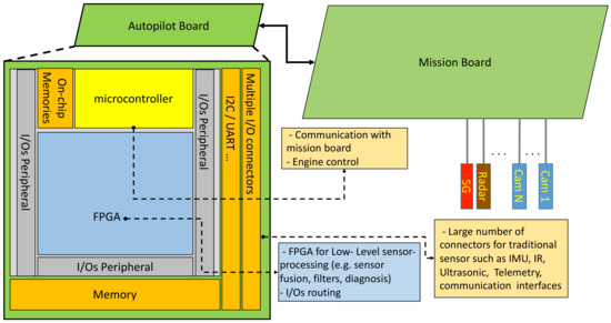 - State estimation and stabilisation control loops: State estimation typically relies on a type of Kalman filter. Depending on the number of states and parameters in the aircraft dynamic model, this task could require a significant amount of computational resources. The amount of computation is mainly related to matrix operations. Floating-point computations can be very meticulous to reach accuracy and stability requirements. The control of attitude, position and speed mainly relies on close-loop control. Typical implementations involve multichannel PID approaches [39]. Due to the nature of this function (low-level), most of the computational demands are handled by using dedicated embedded hardware. However, researchers have proposed architectures where autonomy levels are linked to different layers of control [40], in which more computational resources are necessary.