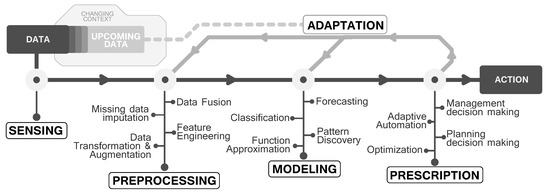- In the preprocessing stage, adaptation could be understood from many perspectives: the incorporation of new sources of data, the partial or total failure of data capturing sensors, which lead to an increased need for data fusion, imputation, engineering or augmentation.