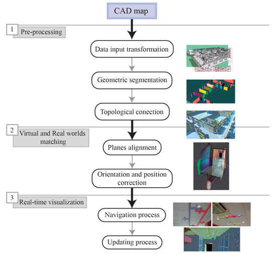 In this section, the algorithms developed to scan, process, and visualize indoor infrastructure as 3D augmented models on the user environment are presented. The key idea is to detect in real-time the user position and orientation on one floor of the surveyed building by scanning the user environment and comparing it with its replicated virtual scenario. Thus, each part of infrastructure becomes visible in mixed reality after the user environment has been recognized. Then, it is possible to enable a real-time visualization of hidden facilities, which can be inspected onsite by an intuitive way using portable devices. The methodology is based on three main stages: (1) preprocessing input data, (2) real-world scanning and matching of virtual and real worlds and (3) real-time visualization in mixed reality.