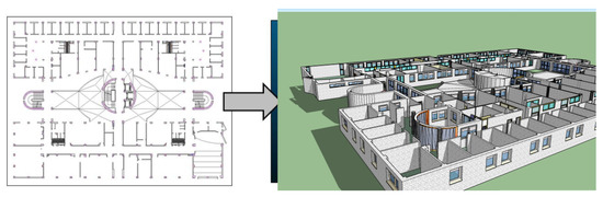 45]. Then, these 2D lines are converted to 3D walls, providing surfaces of walls, ceilings and floors. This semiautomatic process is performed using SketchUp software [