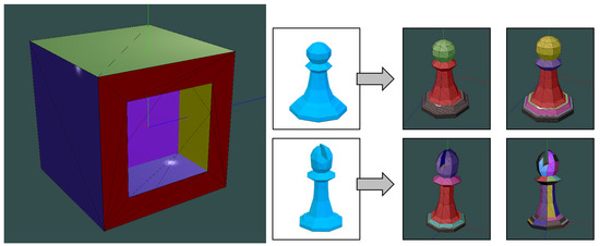 Figure 4. Using diverse colors, the cube is separated by the different planes containing their faces. In this case, planes associated with these faces are well defined because neighboring faces are orthogonal. However, as some walls in the building are curved, a coplanarity factor has to be defined in order to determine those walls that take part of the same section. The right image on