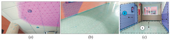Table 2 shows the average error regarding the six experiments carried out (1) using markers to estimate the initial orientation of the camera user and (2) without makers only considering inertial measurements of IMU’s device, that is, the compass. Our markerless-based approach requires that the 3D model of the building in the virtual world is orientated to the north. In this way, when the camera user is pointed to the north, the direction vector of the camera in the virtual world is aligned with the Y-axis according to our reference system in the virtual world. According to the results of the validation process, our method was focused on solving the rotation about the Z-axis by applying a rotation on virtual planes to be fully aligned with scanned planes from the real world. Thus, the angle between a virtual plane and its corresponding scanned plane from the real world is almost 0.