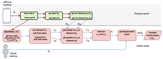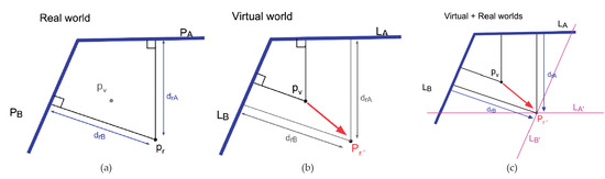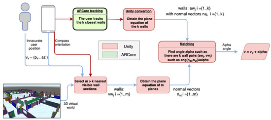 Once real distances and are obtained, then we focus on the virtual world. We know in the ARCore reference system but not in the virtual one. The user estimates that they are in , but there can be several error meters from . Then, is the exact position of the user camera in the virtual reference system to match physical and virtual worlds.