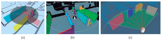 Once triangles in the same wall section are topologically connected, the last process also consists of adding new topological relations between nearby wall sections. This relationship between wall sections helps to find the building geometry to be compared with the scanned planes from the real world. The result is a real-time matching between virtual and real worlds. In the right image of