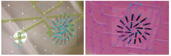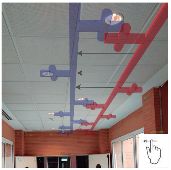 Once the virtual representation of the building floor was obtained, the following step was to add topological relations to each triangle and to perform wall segmentation. This implies to separate the geometry of walls into sections, which restricts the search scope for planar surfaces and accelerates the alignment process. A wall section is considered a set of connected triangles matching a single plane. Then, these triangles must be adjacent and have the same normal vector. Therefore, the method described in this section puts together annexed triangles with the same orientation to construct a wall section. Therefore, a wall section is represented by a unique normal vector, which will be compared with the normal vector of those flat surfaces tracked in real time with ARCore. We rely on the premise that facility networks are spatially linked to virtual walls in the original CAD and that these constraints are maintained in 3D. Therefore, when real and virtual wall planes line up, facilities are accurately placed, as observed in