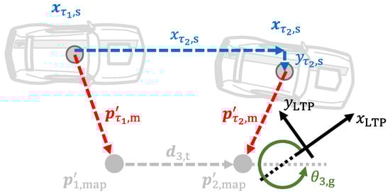 where are the coordinates of in LTP, is the yaw angle of the vehicle, is the velocity over ground of the vehicle, and is the sideslip angle of the vehicle. The used measurement noise covariance matrix and state vector are defined as follows