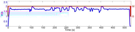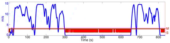 For an adequate estimation of the vehicle state by means of IMUs, it is essential to ascertain when the vehicle is not moving because it is at this time that both the velocity over ground and the proper acceleration are equal to zero []. Even though, historically, vehicle speed sensors were designed to measure velocity rather than when a vehicle is at a standstill [], they are now able to accurately measure a standstill. Nonetheless, there could be disadvantages if external devices continuously read the vehicle sensor data in real time (for example, through the OBDII interface). Even when various methods [,,] and tools used by manufacturers [] theoretically allow a CAN-bus use of ≈80% [], recent studies suggest that CAN-bus messages can still miss their deadlines [,,]. The traffic within a CAN-bus would increment if an external device continuously accesses the vehicle sensor data in real time, which could further increase the risk that the CAN-bus messages miss their deadlines. Consequently, more research is required before considering fusing the vehicle on-board sensors with external IMUs. Alternative sensors for measuring the velocity over ground, such as the Wheel Pulse Transducer (WPT) [] or the Correvit [,] increase testing costs and complexity.