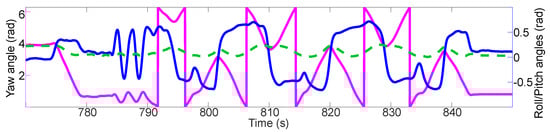 where and are called “horizontal accelerations”. The measurement vector of the Extended Kalman Filter (EKF) that is designed in this research work (Section 2.3) includes , and as measurement variables. The process from Equation (14) to Equation (34) is repeated with each new inertial measurement while the vehicle is in motion to keep updating the values of the measurement vector of the EKF.