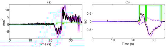 Other works found in the literature address the issue of drifting too, however, they tend to limit the scope of their research to simulation environments [,] or require additional parameters that cannot easily be estimated with an IMU []. Conversely, the drift recognition in this work is designed to operate by performing consistency checks between two estimated state variables: the lateral acceleration and the sideslip angle. As demonstrated later, these state variables provide enough information to perform a robust drift detection.