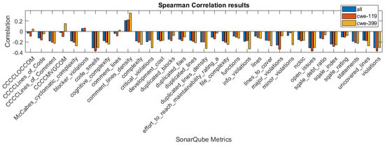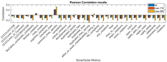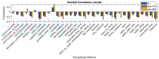 In Figure 1, Figure 2 and Figure 3, we present the correlation coefficients for different coefficients and subsets of the dataset, considering both types of vulnerabilities, and also specific vulnerability: CWE-399 or CWE-119. We clearly see that among the coefficients, the highest values are reached for the CWE-399 subset. In the majority of cases, the correlations are negative, and their strength is weak to moderate. We can also observe that the correlation coefficients’ values are similar for two rank correlation coefficients, Kendall’s and Spearman’s, and differ significantly for Pearson’s coefficient. This can be caused by the fact that some of the metrics used in this study are ordinal values with a small number of values and that the Pearson correlation can only determine the linear relationship between the variables.