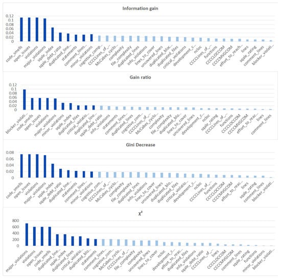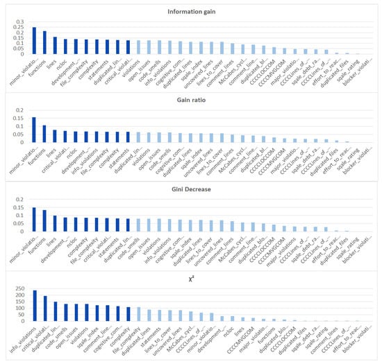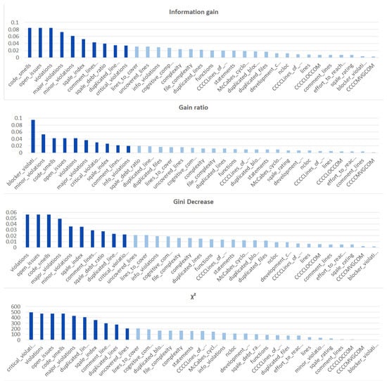 We ranked the features using the information gain, gain ratio, Gini decrease, and technique to determine the ten best features for each of the methods, which we then used to train the thirteen ML models. We chose the ten best features in the sense of the whole dataset to standardize the evaluation process. The results of this analysis can be seen in Figure 4. The features used in the reduced sets are listed in Table 3. We can notice that seven out of ten features are the same for all of the subsets. These features are: code_smells, open_issues, violations, major_violations, sqale_index, comment_lines_density, and critical_violations. Most of them are connected to the number of issues found in the code by SonarQube, which seem to be reasonable choices to build the vulnerability prediction model. What is crucial is that none of the pairs of subsets contain the same information.