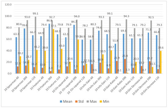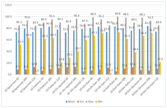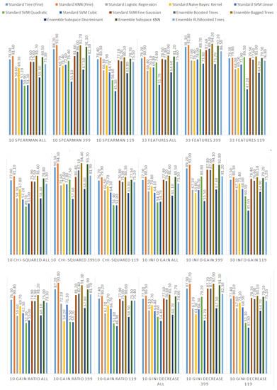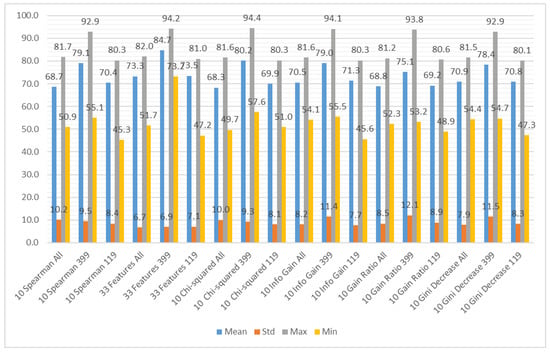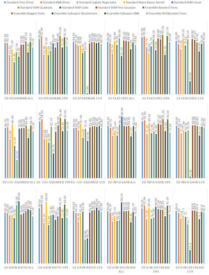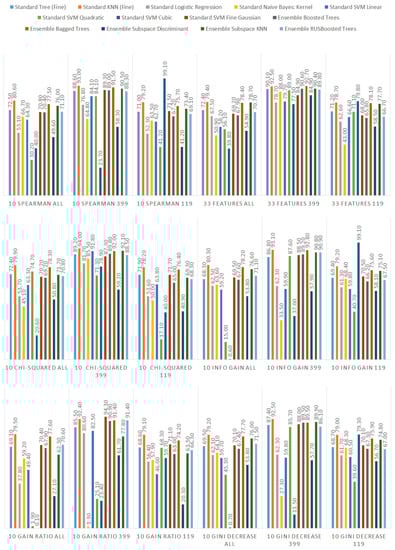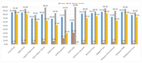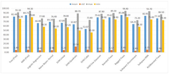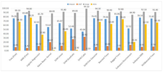 In Figure 10, it is visible that in terms of accuracy, the classifiers with the highest performance are the KNN algorithm and bagged trees. Their performance is also good in terms of the maximum and minimum value, as well as the standard deviation, that is 6% for both models. The models that obtained the worst results were logistic regression, naive Bayes, SVMs (the exception was the SVM with the Gaussian kernel), and subspace discriminant.