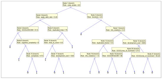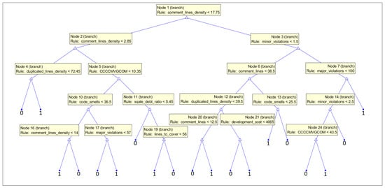 In Figure 16, we present the structure of the tree trained on the subset with CWE-399 vulnerabilities considered. The feature comment_lines_density was used in the root of the tree. Furthermore, the parameter comment_lines is high in the hierarchy. This can suggest that the code might be complicated and needs many comments to be understood by the programmers. Many comments can also signal inadequacies in the code, but also the maturity of the code. Furthermore, features from the issue category (minor_issues and major_issues) are important for the prediction. They determine a number of potential problems in the code; here, the power of static code analyzer rules is used. Maintainability features (technical debt and code smells) are also used. The low maintainability and complexity of the code result in fault-proneness (proven in an empirical investigation [78]).