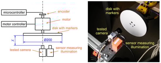 We printed a contrast black dot 1 mm (12 pixels) in diameter or five different mm ( pixels) ArUco markers (squares with a black background and a white generated binary pattern [], marker generation and detection software are available in OpenCV []), both on a white background, and pasted it to a rotating disk, at the radius of 85 mm. The disk was propelled by a BLDC servo motor D5065-270kv [] controlled by an ODrive v3.6 controller []. An encoder CUI Devices (Lake Oswego, OR, USA) AMT102 [] with 8192 counts per revolution tracked the motion of the motor shaft. An STMicroelectronics (Geneva, Switzerland) STM32 microcontroller unit (MCU) [] performed the encoder readout and synchronization (see below for details). We could vary the number of revolutions in the range –40 rps, which corresponds to the dot/marker peripheral speed in the range –21 m/s and mean image speed –260 kpx/s. The scene was illuminated by an adjustable non-flickering panel light FOMEI (Prague, Czech Republic) LED WIFI-36D with color temperature set to 3700 K [].