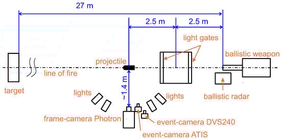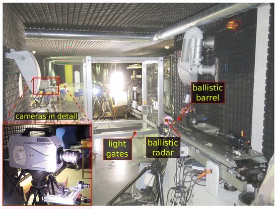 We used a ballistic Doppler radar Prototypa (Brno, Czech Republic) DRS-01 [] together with Kistler (Winterthur, Switzerland) Type 2521A [] light gates for independent measurement of the bullet speed. Furthermore, the light gates also provided the trigger signal for the synchronization of the camera records. Because the output signal from the light gates is of an irregular shape, we used the programmable triggering unit Prototypa PTU-01 [] to create a regular rectangle impulse based on the light gate output signal. The rising edge of this rectangular impulse triggered the record of the tested cameras. The Veritaslight (Pasadena, California) Constellation 120 [] LED lights and DedoLight (Munich, Germany) Dedocool [] tungsten lights illuminated the scene during the ballistic measurements.