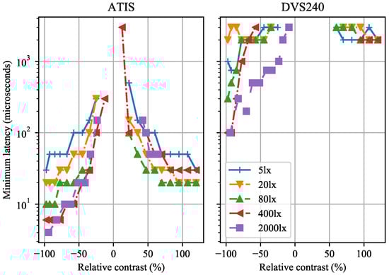 Larger relative contrast magnitude and larger illuminance cause lower minimum latency, see Figure 4. We observed that the latency of negative polarity events is lower than the latency of positive polarity events given the same absolute contrast. The ATIS sensor consistently outperformed the DVS240 in terms of the minimum pixel latency.