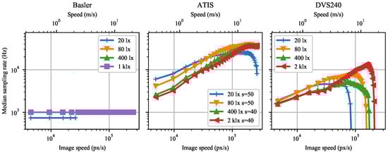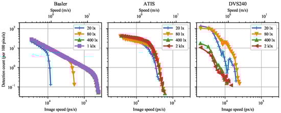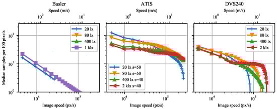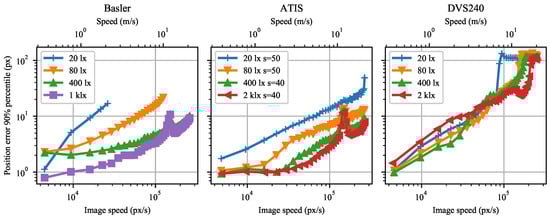 However, we noticed several exceptions to the general rule for the DVS240 camera. Surprisingly, the position error is approximately twice as large with the 2000 lx illuminance as with the 400 lx for image speeds below 40 kilo-pixels per second (kpx/s). Furthermore, there seems to be a short speed interval around 80 kpx/s where the position estimation error plot lines of all the illuminance levels intersect.