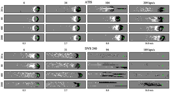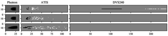 We observed the readout aggregation in action at large image speeds when the sensor readout capacity limits were reached. Both the ATIS and DVS240 event-cameras read multiple events from a single pixel row at the same time. See, for example, the fastest dots and the slowest ballistic projectile recorded by the DVS240 in Figure 6 and Figure 14 or the fastest markers recorded by the ATIS in Figure 12. In [], we observed that these readout limitations prevent accurate tracking of ballistic projectiles flying along pixel columns instead of pixel rows of the ATIS camera.