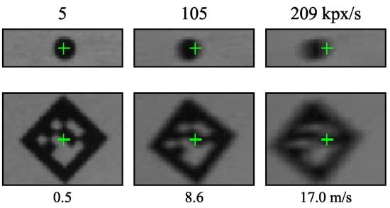 Sample images from the global shutter Basler camera. The green crosses show the ground truth position of the dot or marker center at the start of exposure. Exposure time 59 µs, sensor illuminance 1000 lx.