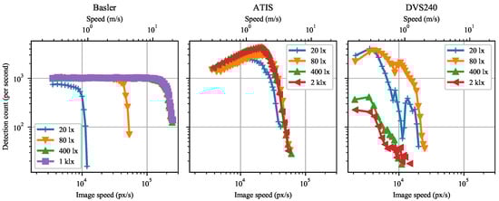 We needed to set a higher ATIS pixel sensitivity at lower illuminance levels (20 and 80 lx) than at higher illuminance levels (400 and 2000 lx, sensitivity ) in order to obtain the lowest position errors presented. In contrast, we obtained the lowest DVS240 errors with the same bias setting.