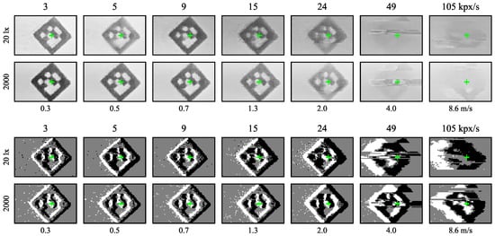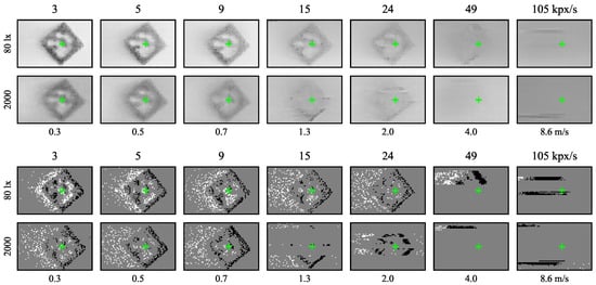 Sample ATIS (top) and DVS240 (bottom) event images of the black rotating dot moving left to right on white background at four different speeds (horizontal axis) and four different sensor illuminance levels (vertical axis). All images are cropped to pixels from the original sensor plane with 200 events. Positive polarity events are white, negative black, and the background is grey. The green crosses indicate the ground truth median coordinates of the negative polarity events.