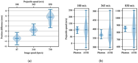 (a) Distributions of the differences between the ATIS and Photron estimates of horizontal projectile position. Data were measured for three projectile speeds along a trajectory segment 440 mm long. A positive difference means that the ATIS estimate lags in time behind the Photron estimate. The horizontal lines of each violin show the maximum, median, and minimum position differences; (b) distributions of the ATIS and Photron projectile speed estimates along a trajectory segment 440 mm long.