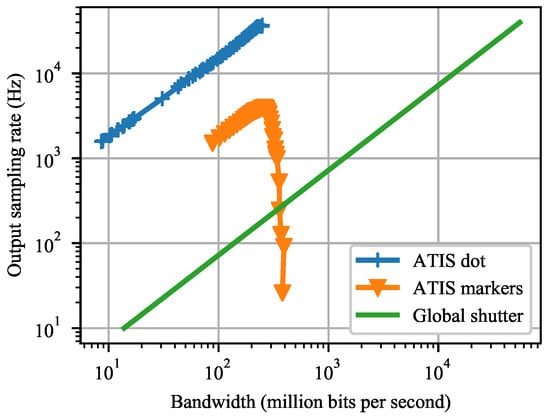 A bandwidth-performance plot shows how much data an event-camera (ATIS) and a global shutter frame-camera generate to reach a certain output sampling rate. The output sampling rate captures the number of marker detections or the number of rotating dot position estimates, both per second—assuming the strongest lighting tested (ATIS), 27 bits per event on average, negligible frame-camera exposure time, and sensor resolution of pixels.