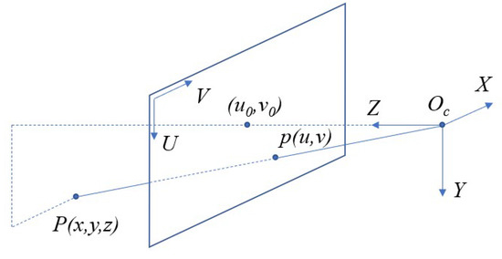 For a depth camera, its imaging process can be described by the pin-hole model, as depicted in Figure 1. A 3D point in the real world is projected onto an image plane through a tiny hole. The model can be expressed as follows: