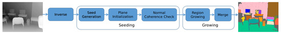 In earlier years, it was intuitive to extract planes based on visual cues, with the assumption that pixels in one plane have a similar texture and appearance [7]. However, those methods will fail as planes can have a similar appearance to other parts. In recent years, due to the rapid development of structured light and time-of-flight techniques, consumer RGBD cameras have become popular in practical applications of computer vision and robotics. RGBD cameras can obtain spatial information, and preserve it in an organized manner. With access to spatial information, the 3D structure of an environment can be retrieved based on SfM (Structure from Motion) or SLAM (Simultaneous Localization and Mapping) technology. Thus, many methods have been proposed based on reconstructed point clouds [8,9]. As 3D construction is a time-consuming process, these plane extraction methods run in an off-line regime. In this work, a plane representation is formulated in inverse-depth images, in which each pixel value is the mathematical inverse of the corresponding one in depth images, and based on this, region growing is directly applied on images, avoiding 3D reconstruction of the scene.