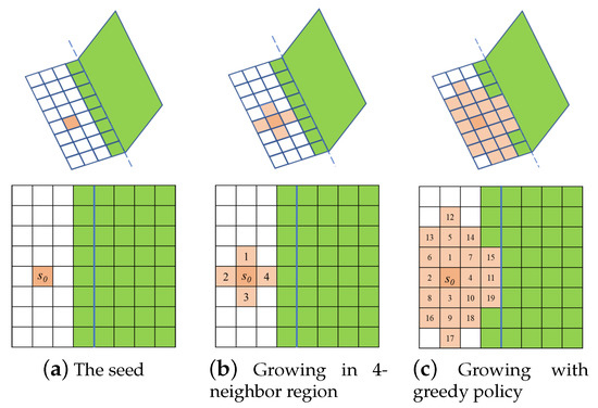 A pixel-wise region growing algorithm is implemented to extract a continuous plane, once a plane initialized. The region growing begins from the seed, and explores the four connected neighboring points around the region recursively, as depicted in Figure 3. The borders of the region growing are not constrained, thus it can extract the entire plane at once.