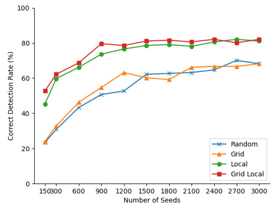 Four different seeding strategies are compared in this experiment, namely Random, Local, Grid, and Grid Local. The Random strategy is a completely randomized seeding strategy, which is similar to the initialization of RANSAC, and its exploitation efficiency was analyzed by Qian et al. [9] Grid and Local strategy, each has only one individual module of the proposed Grid Local strategy, also serve as benchmarks.